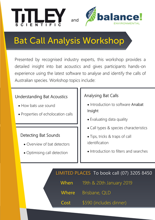 Balance! Environmental has teamed up with Titley Scientific to offer another workshop on bat detection and call analysis, this time in Newcastle, NSW, from Friday 18th to Sunday 20th October 2019. Download a flyer here. Our Sydney (June) and Brisbane (January) events were very popular and booked out early, so get in quick to secure your place in the Newcastle workshop.